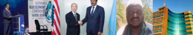 l-to-r: HE the Pres addresses the Blue Economy Conference in Nairobi and receives the credentials of the the new US Ambassador; Elmi Yare, the controversial cleric killed by aS; and the headquarters of Hormuud Telecoms