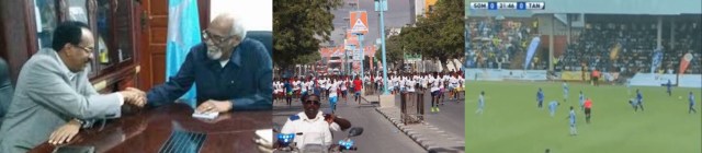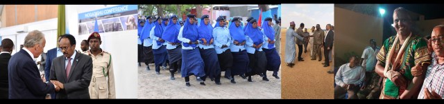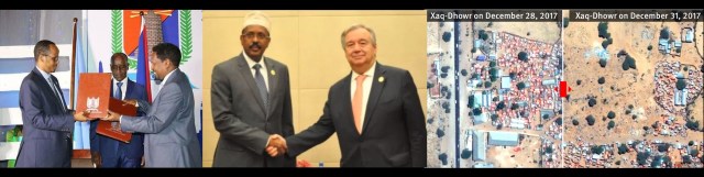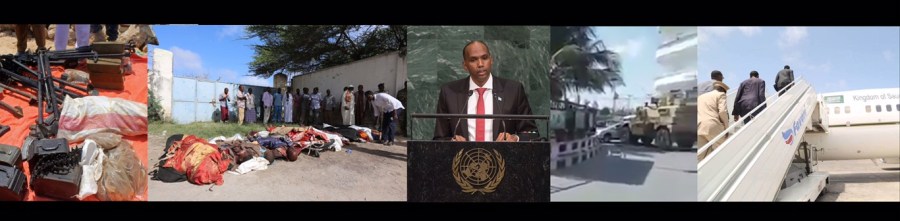 l-to-r: President Farmajo with supportive European politicians at the Somalia Partnership Forum in Bruxelles and then meeting his Eritrean counterpart; the Ministry of Interior in Mogadishu under attack; and the tools of FGM